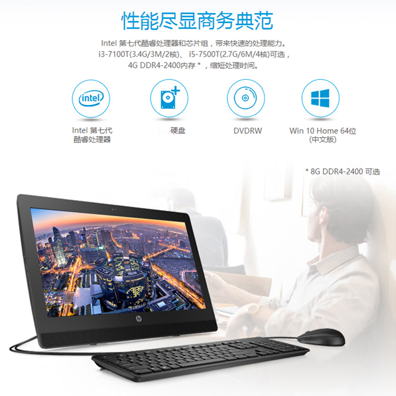 i5-7500T(2.7G/6M/4核)/4G(1*4G DDR4 2400)/500G(2.5”,SATA)/超薄SuperMulti DVDRW FDD/Windows 10 Home 64位/USB键盘/USB Optical鼠标/100万像素 摄像头(附带隐私挡片)/内置麦克风/内置商业级音响/内置蓝牙4.0/90W 89%高效节能电源/4*USB3.1 Gen 1/ 2*USB2.0/20" 宽屏LED背光防眩光液晶显示器/3-3-3/标配/内置Intel 3168 802.11 AC无线网卡带蓝牙/相框式底座