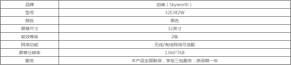 当前位置:首页 > 强制节能产品-电器-电视机 > 创维(SKYWORTH)32E382W 32英寸蓝光高清 二级能效节能 酒店功能 智能家用商用电视机