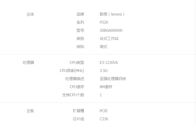 联想 台式工作站 P320 E3-1230V6/8G ECC/1TB/无显卡/RAMBO/DOS