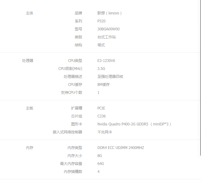 联想 台式工作站 P320 E3-1230V6/8G ECC/1TB/P400/RAMBO/DOS