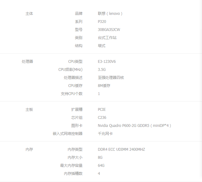 联想 台式工作站 P320 E3-1230V6/8G ECC/1TB/P600/RAMBO/DOS