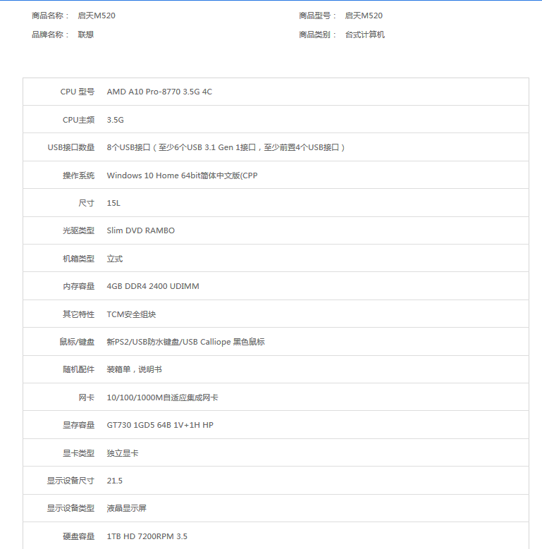 当前位置:首页 > 内蒙品目-计算机及周边设备-计算机设备-台式计算机 > 〔内蒙库存〕联想 M520-D506 商用办公税控台式机电脑定制 主机+19.5英寸显示器套机