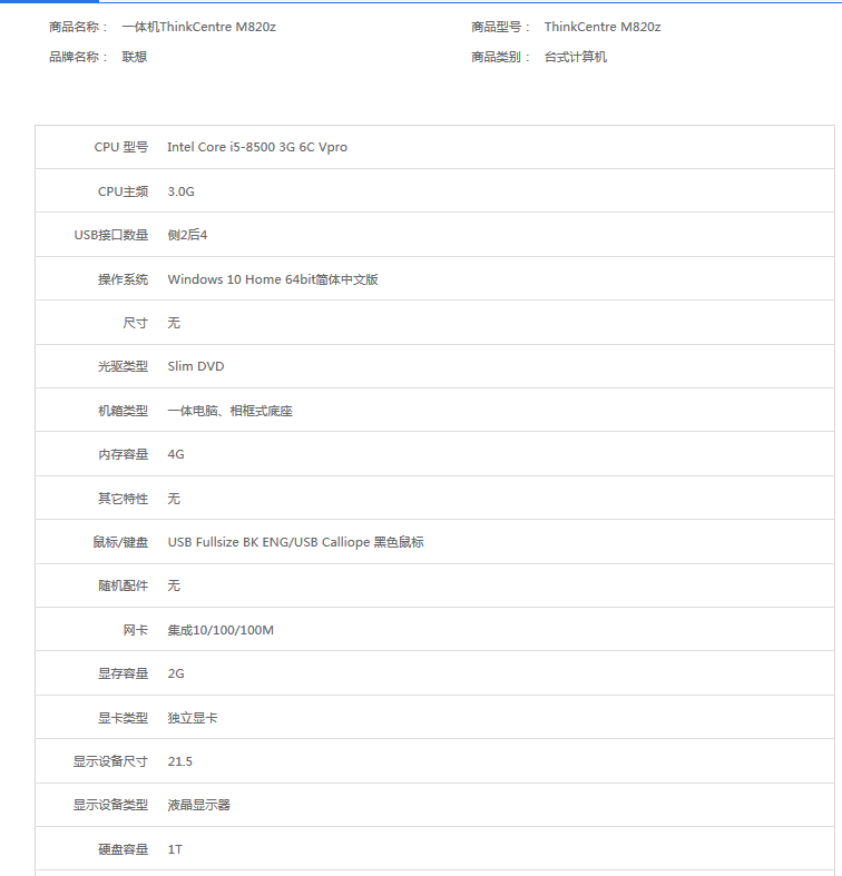 当前位置:首页 > 内蒙品目-计算机及周边设备-计算机设备-台式计算机 > 〔内蒙库存〕联想 一体机ThinkCentre M820z 商用台式机i3-8100/4G/128GSSD+1TBHDD/集显/Win10专业版 定制