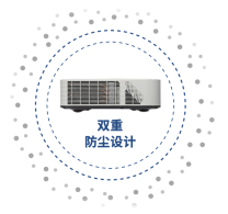 SNP-AH360UT系列投影机采用创新式的光源光机一体化设计和光路密封双重防尘设计,可以完全阻隔外部灰尘和微小颗粒进入光机系统中,并且整个光机系统完全密闭,已通过IP6X严格测试,即使没有过滤网,也能大幅提升系统稳定性,可长时间保持投影画面亮度和色彩饱和度