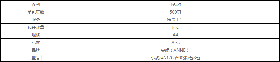 当前位置:首页 > 办公及体育用品用品-办公用纸-复印纸 > 安妮(ANNE)小战神A4 70g 复印纸 500张/包 8包/箱