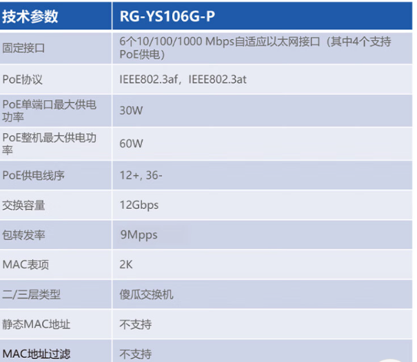 锐捷6口干兆PoE监控交换机RG-YS106G-P PoE功率60W 满载摄像头双上联接口企业园区安防监控交换